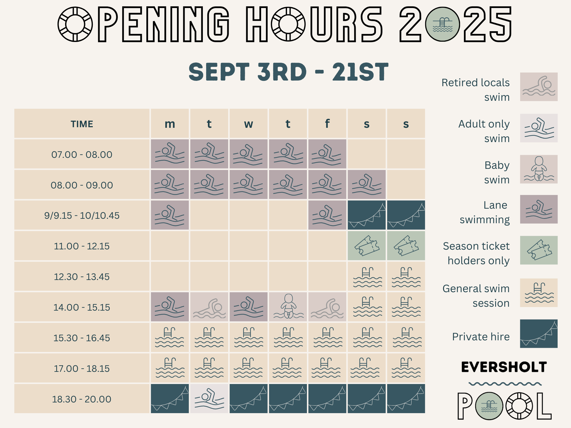 Summer holiday timetable (subject to change, please check the product pages for time slots available)